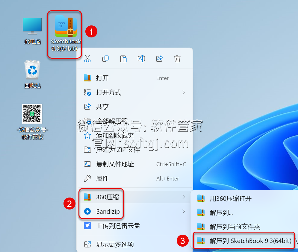 1.解压安装包:①鼠标右击【SketchBook 9.3(64bit)】压缩包②选择电脑上安装的解压软件(如:360压缩)③点击【解压到SketchBook 9.3(64bit)】。