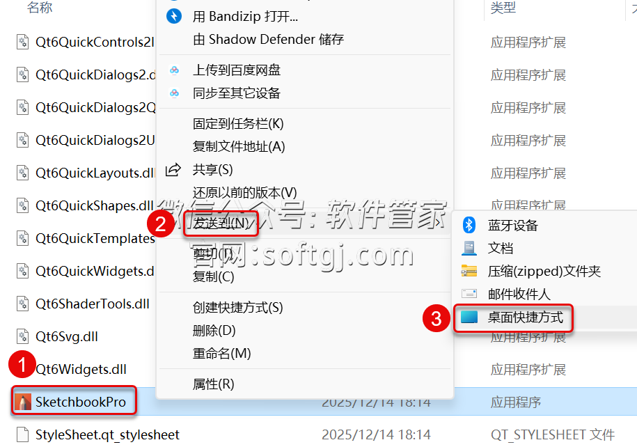 6.创建桌面快捷方式:①鼠标右击打开后的【SketchbookPro】②选择【发送到】③点击【桌面快捷方式】。